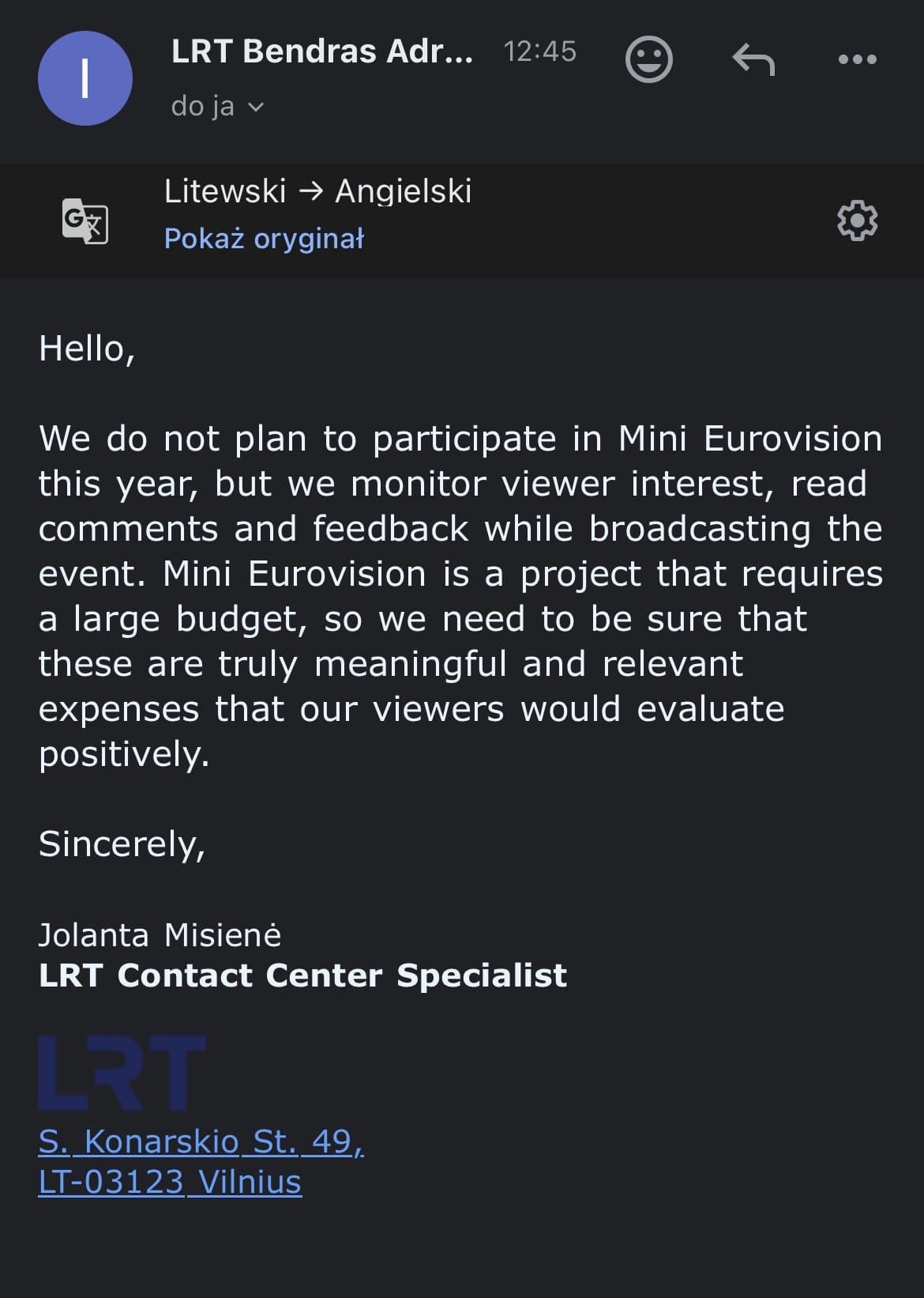 Jolanta Misienė, która jest przedstawicielką działu kontaktu litewskiego nadawcy LRT poinformowała nasz portal, że stacja NIE zorganizuje powrotu 🇱🇹 Litwy podczas 🇬🇪 Eurowizji Junior 2025.