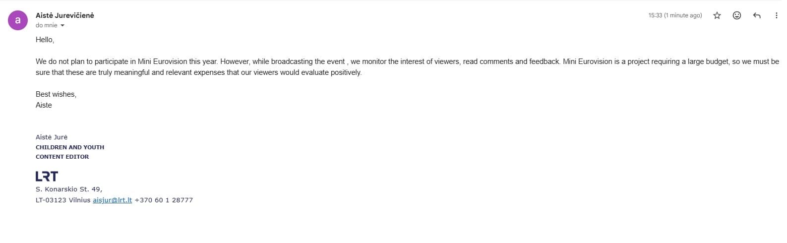 Informację potwierdziła również Aistė Jurė, która jest szefową działu treści dla dzieci i młodzieży litewskiej telewizji. Jest to również ta sama osoba, która osobiście podpisała dokument zawierający informacje o zadaniu pytań do litewskich dzieci w pewnej grupie wiekowej. Jak wiadomo, wśród wspomnianych pytań znalazło się wówczas pytanie o potencjalną organizację powrotu Litwy na Eurowizję Junior.